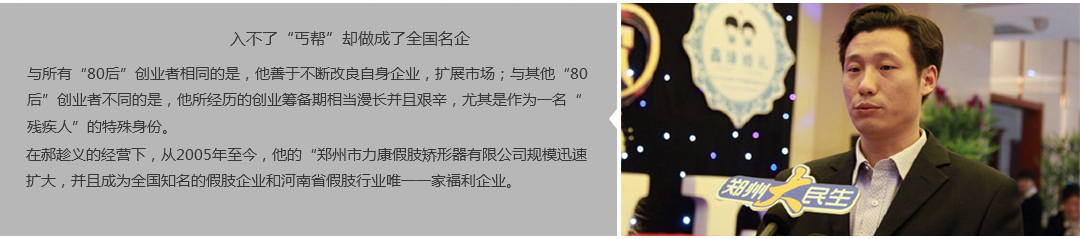 鄭州市力康假肢矯形器有限公司(簡稱力康),是一家專業(yè)從事假肢矯形器的設計、研發(fā)、制作及裝 配的專業(yè)機構。成立于1992年是河南省唯一一家福利企業(yè)。力康下設業(yè)務部、技術部、住院部、康復 部、售后服務部,并配有現(xiàn)代化的裝配車間和功能齊全的訓練大廳,為殘疾朋友康復訓練提供了可靠 保障??偨浝泶┐骷僦嗄?,有著豐富的臨床經驗和親身體會;多年來,力康已為全國幾十萬名殘疾 朋友安裝上舒適、美觀、耐用的假肢和矯形器具,使他們更大限度地恢復了正常的工作和生活?!爱a 品即人品”的質量理念、先進的技術、實惠的價格、完善的售后服務是力康取勝的法寶……